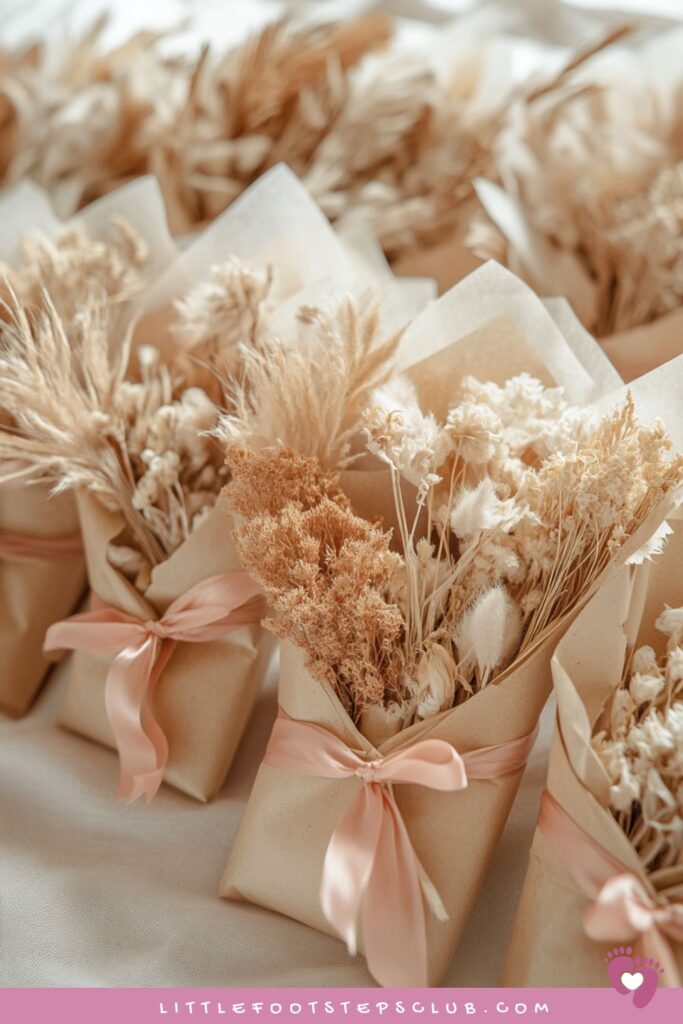 Wrap small dried flower bunches in kraft paper and tie with pastel ribbons.