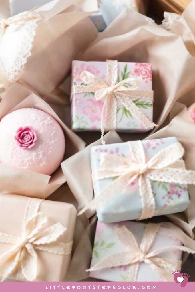 Pretty pastel soaps with floral textures or essential oils wrapped in delicate paper.