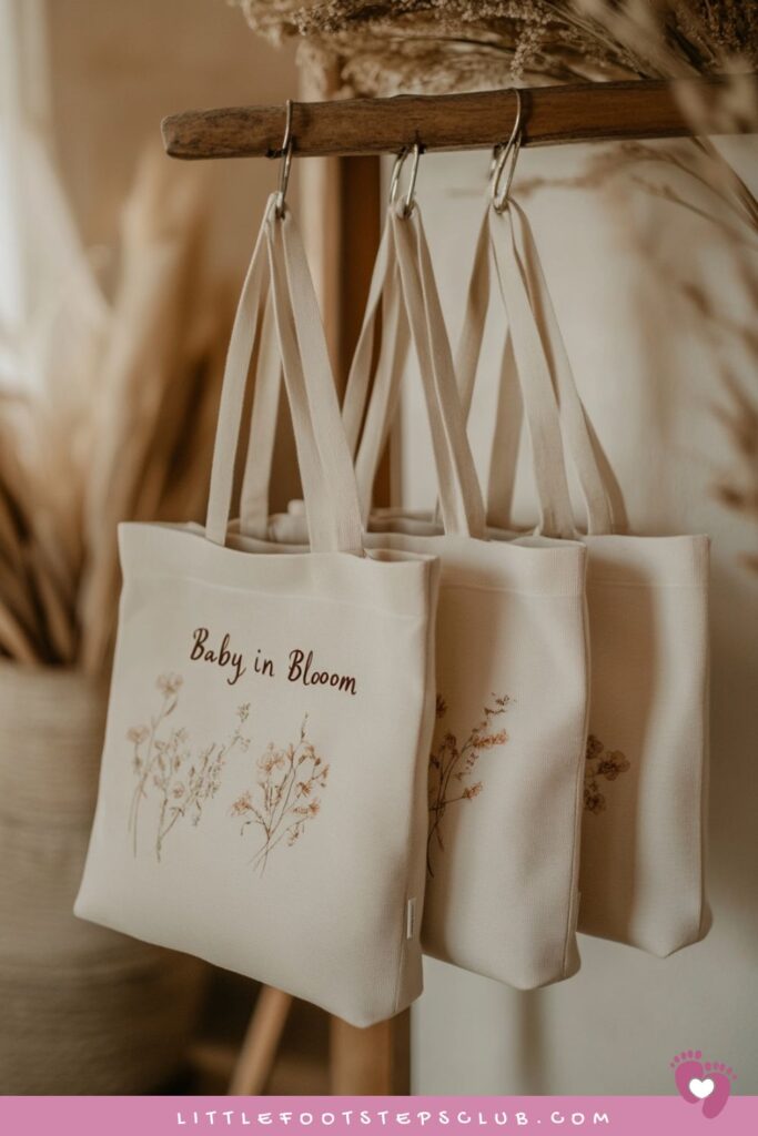 Reusable totes with a Baby in Bloom illustration make useful and aesthetic gifts.