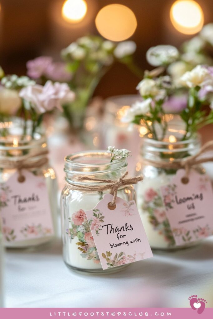 Personalized floral-scented candles with tags like Thanks for blooming with us.
