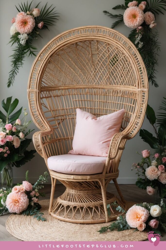 Design a floral throne for the mom-to-be using a wicker chair wrapped in greenery and florals.