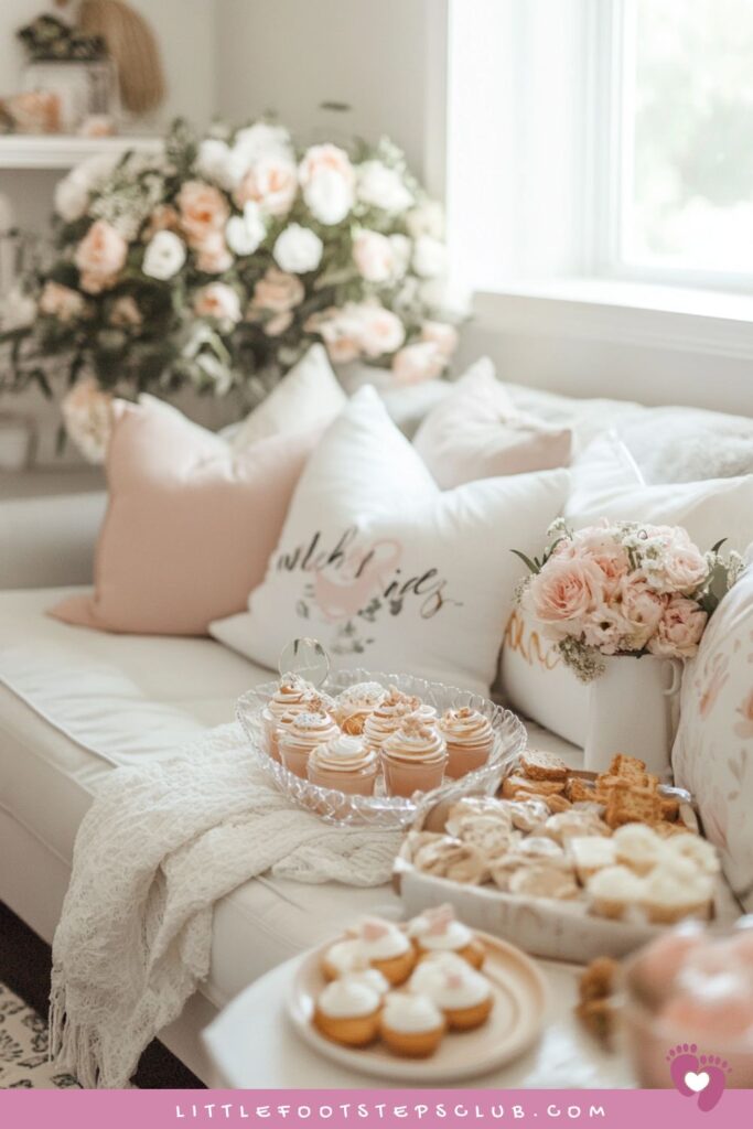 Set up a cozy area for the mom-to-be with plush seating, mocktails, her favorite snacks and a little bouquet just for her.
