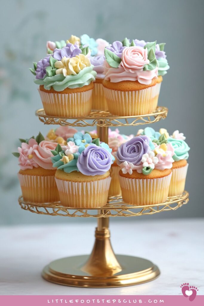 Pastel cupcakes piped with buttercream roses or daisies — almost too pretty to eat.