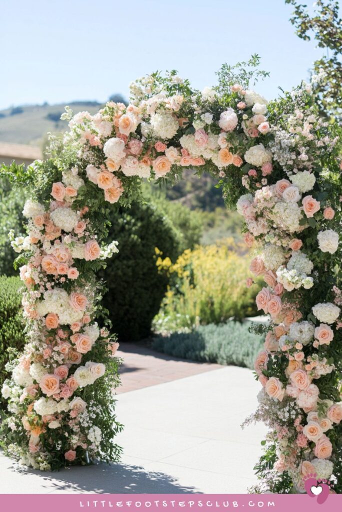 Create a breathtaking first impression with a lush archway made of real or faux blooms in pink, peach, and cream tones.