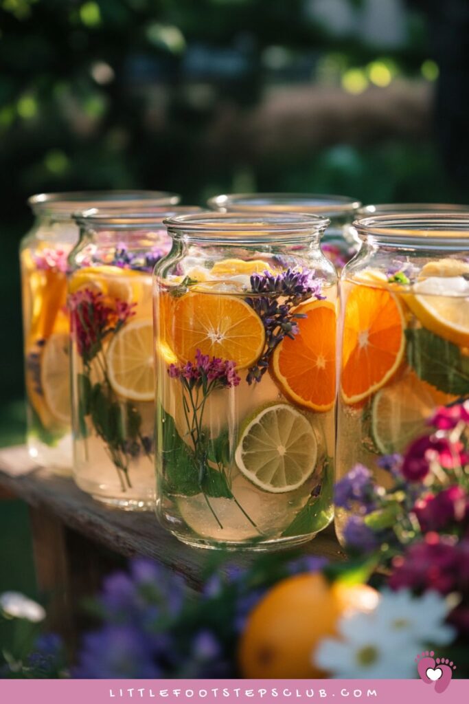 Serve pink or lavender drinks in glass jugs with edible flowers or fruit slices.